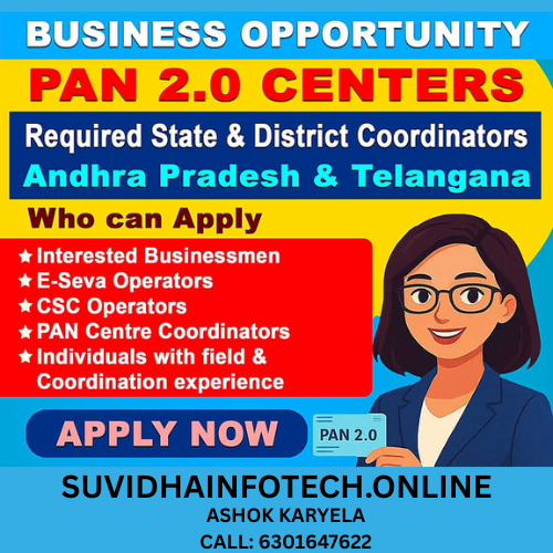 SUVIDHAINFOTECH.ONLINE India has been authorized to apply PAN CARD across India through our Super Distributor ,Distributor & retailer network. Retailer will able to make online application of New PAN Card and Correction / Duplicate. A great opportunity for Super Distributor& Distributor to authorized Retailers become agent for PAN Card. More details Contact : 6301647622/8464969344